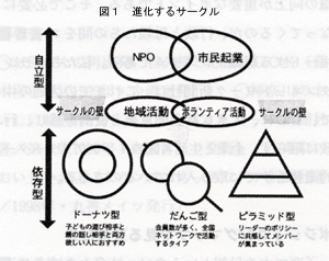 一口にサークルと言っても、 親子のふれあいのサークルからNPOや有限会社のように法人化するサークルもあって、 その活動の多種多様性に驚かされる。 あえてセグメント化するならば、 以下の図1の通り大きく3形態に分けることができる。 |