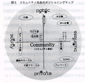 子育て中の母親というのは、 社会との接点が遠くなりがちである。 そこで、 社会の中で自分は今、 どのポジションにいるのかを認識することが大切になってくる。 これまでの生活の拠点は、 「自宅」 と 「公園」 と 「スーパー」 というトライアングル地帯に限定されていた母親が、 社会全体を俯瞰して見ることで、 自分の置かれている社会的なポジションを明確にすることができるようになるのである。 図2の個人的な活動から社会的な活動へ、 そして、 社会的活動からビジネスへ等、 活動の移行形態がわかる。 母親たちはサークル活動や地域活動など、 さまざまな人々との交流により、 意識を持ち始める。 単なるボランティアから自立型の地域活動への移行こそ、 21世紀のコミュニティ構想の第一歩なのである。 |