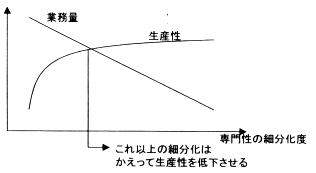この場合の解決策は、 第三の道−すなわち外部の人材育成力を活用するというものである。 具体的にはアウトソーシングがある。 仕事の専門分化がすすむと、 その専門性を使えるような仕事量が減少する。 結果として専門性は向上しても生産性が低下することになる。 (図)。 これまで、 この問題の有効な解の一つは多能工化であった。 職種別労働組合のない日本ならではの解決策である。 しかし、 業務量が少ないという前提の下では生産性だけでなく専門性も向上して行かない。 ということはお家芸の暗黙知システムも機能しないということである。 結果として選択されるのがアウトソーシングである。 アウトソーサーの側は、 発注企業側で行うにしては量の少ない業務を集めることで専門性と生産性を実現する。 この場合、 発注企業の側は長期雇用制度を維持している。 但し、 この制度の適用対象となる社員の数は、 アウトソーシングを利用しない場合と比べると減っているはずである。 ここで、 アウトソーサーの側も長期雇用制度を採用しているとすれば、 マクロ的に見た場合、 仕事の担い手が発注企業の社員からアウトソーサーの社員に変わっただけであり、 産業界全体としては長期雇用が維持されることになる。 こう書くと一見何も変わっていないように思えるだろう。 しかし視点を変えると、 大きな変化があることに気付く。 アウトソーサーのほうが発注企業より専門性と生産性が高いという前提を置くと、 社会全体として、 その仕事に携わる人数が減るのである。 言うなれば、 企業単体ではなく、 社会レベルで合理化が行われているのである。 ここで思い起こさなければならないのは、 日本の長期的な労働力需給である。 生産年齢人口のピークは1995年、 およそ8700万人であった。 そして2015年にかけて、 20年間でおよそ1000万人の減少が見込まれている。 長期的な経済成長の為には労働力が不可欠であるが、 現在の日本は、 少くとも量的にはこの条件を充たしていない。 労働力減少の下で成長を実現するためには、 生産性の飛躍的な上昇が不可欠なのである。 そしてこれを実現する為の手段の一つが、 人材の社会的再配置なのである。 メイテックの前社長 (現相談役) の大槻三男氏は、 同社の社内報で、 人材の 「社会財」 化の必要性を説いているが、 この発想には企業の論理を超えた真理がある。 | ||||