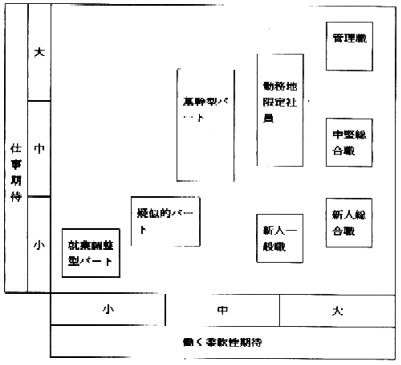(2) 「内外間距離」 と賃金制度 これまで 「内外区分」 を決める二つの基準について説明してきたが、 現実には、 労働者を 「内部化された労働者」 と 「外部化された労働者」 に明確に区分することは難しい。 たとえば 「内部化された労働者」 (正社員) の現状をみると、 転勤のない勤務地限定社員は明らかに 「外部化された労働者」 に近い存在である。 また 「外部化された労働者」 (非正社員) についてみると、 家庭の都合に合わせて短時間、 補助的な仕事に従事する就業調整型のパートタイマーのように 「内部化された労働者」 から遠い位置にいる労働者から、 労働時間と仕事が正社員とほとんど変わらない基幹型パートタイマーのように 「内部化された労働者」 にきわめて近い所に位置する労働者まで多様である。 このようにみてくると、 正社員と非正社員といったように 「内外」 を明確に二分割することは難しく、 労働者の特質は 「内」 から 「外」 へと連続的に変化し、 その間に多様なタイプが存在しうるのである。 雇用形態の多様化は、 「内」 と 「外」 を区分する垣根を確実に壊しつつある。 そうなると二つのことが課題になる。 第一は、 連続的に変化する 「内」 と 「外」 の距離を如何に測るかであり、 上述した 「いまの役割期待」 と 「長期的キャリア期待」 の二つの基準はそのための尺度でもある。 測定された距離と人事労務管理の現状を踏まえて、 第二の課題は、 どのような労働者のタイプを抽出するかであり、 このタイプの多様性に合わせて賃金制度は設計されることになる。 | ||