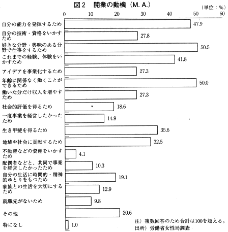 まず、女性という主体の側から見ていくと、女性の社会進出が活発になってきたことが起業意欲を促した大きな要因となっている。総務庁「労働力調査」によると女性の雇用者は、1976年以降一貫して増加傾向にあり、75年代からは、男性の伸びを上回る増加率となっている。94年には2009万人となり、雇用者全体に占める女性の比率も38.6%に高まった。 厚生省の調査(94年2月)によると、一歳児を抱える母親の四人に一人(27.7%)が仕事を持ち、無職者も、妊娠・出産までは仕事をしていたという人が半数を占め、さらに四分の三が「今後、仕事をしたい」(75.7%)と意欲を持っていることが明らかになっている。仕事などで赤ちゃんを保育所に預けている母親は、引き取り時刻を平均一時間近く延ばして欲しいと思っていることも判明した。 これらはいずれも、女性の社会進出の活発さを示す数字といえる。もちろん、これらの数字は雇用面に表れたものであって、女性の起業の活発さを直接には示していない。しかし、雇用という形で社会に出て、企業社会の現実を知った女性が、やがて起業意欲を抱くようになるだろうことは予想できる。 事実、自己実現を求めて企業社会に入っていった女性たちの多くが、そこにはまだ従来の論理が根強く残っていることを思い知らされるからだ。徐々に解消されつつあるとはいえ、企業社会は女性が自己実現するにはまだほど遠い状態なのである。鳴りもの入りでスタートした女性総合職が、バブル崩壊後の不況によってどのような状態に置かれているのかを見れば、このことは明らかだろう。 もちろん、従来も女性が企業社会で自己実現を図ることは、現在以上に困難だった。女性がその壁を突き破ろうとしても、当時はいろいろな制約があるのが普通だった。 その点、最近は女性の進学率も高まり、女性が高等教育に触れる機会が増えてきた。海外での経験も豊富になっている。つまり、女性が壁を突き破ろうとする主体的な条件が整うようになってきたのである。女性の起業が社会的な傾向として定着するようになったのは、より強い主体性を備えるようになった女性が、会社を興すという形で社会の壁を突き破ろうとする試みと見ることができるだろう。女性が自己を実現する手段の一つとして、会社を興すという選択肢が現実のものになってきたのである。 | |||||